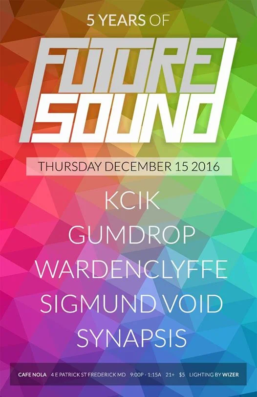 Thanks to the countless supporters who have helped us build Future Sound into what it is today. Please join us on December 15 as we mark *five years* of bringing electronic music to Frederick by throwing our biggest, most elaborate Future Sound yet. We'll have five of our own resident DJs as well as an upgraded, state-of-the-art light show with additional lasers. This event may reach capacity, so arrive early to ensure entry!
