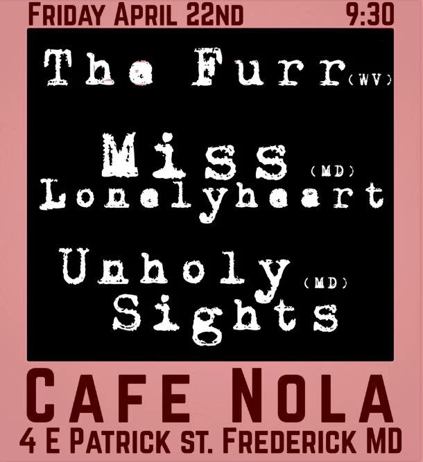 Unholy Sights bring their Annapolis rock & roll to Frederick with Miss Lonelyheart and The Furr. Doors 9:30 | Music 10 pm. 21 and up. Check out their Bandcamp HERE!